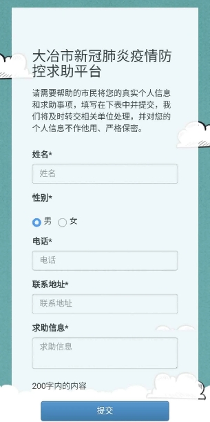 大冶市新冠肺炎疫情防控求助平臺(tái)頁(yè)面截圖