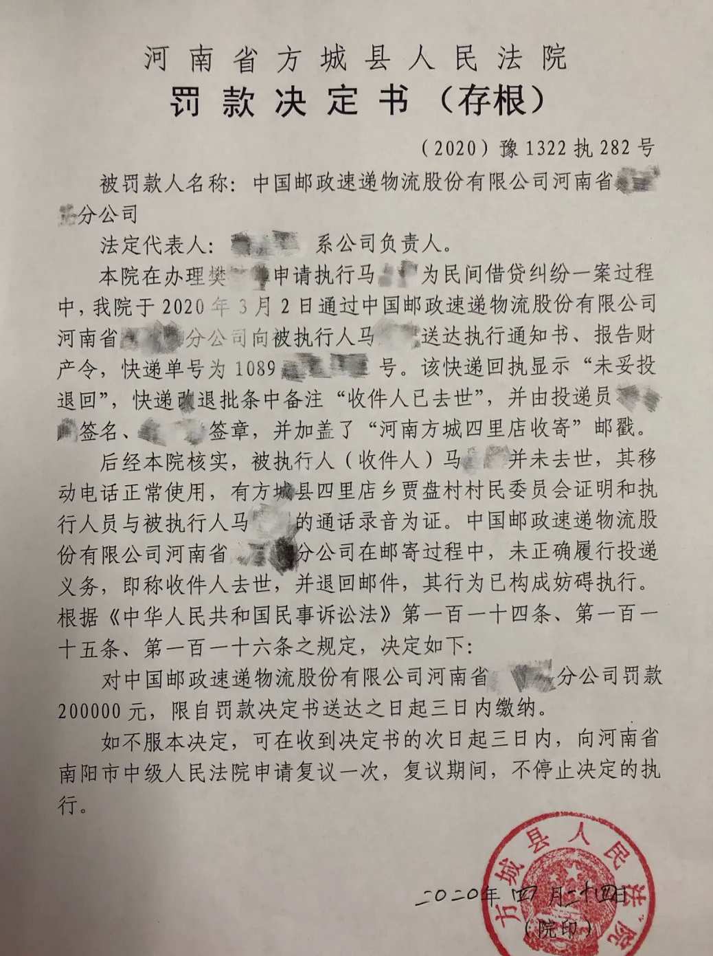 《最高人民法院關于以法院專遞方式郵寄送達民事訴訟文書的若干規(guī)定》第六條規(guī)定中寫道:“郵政機構按照當事人提供或者確認的送達地址送達的,應當在規(guī)定的日期內(nèi)將回執(zhí)退回人民法院。郵政機構按照當事人提供或確認的送達地址在五日內(nèi)投送三次以上未能送達,通過電話或者其他聯(lián)系方式又無法告知受送達人的,應當將郵件在規(guī)定的日期內(nèi)退回人民法院,并說明退回的理由。”最終,河南省方城縣人民法院認為該郵政速遞物流分公司在投遞過程中嚴重不負責任,將未妥投的法院專遞以被送達人死亡為由退回,妨礙了法院執(zhí)行工作,遂依照相關法律規(guī)定,決定對該公司罰款20萬元。