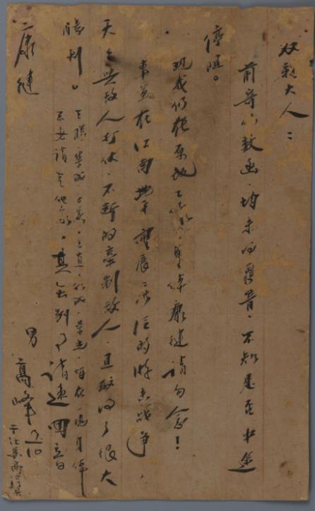 在戰(zhàn)火紛飛、硝煙彌漫的抗日戰(zhàn)場(chǎng)上,林高峰深深明白家人心中的擔(dān)憂和掛念,為了寬慰親人,他及時(shí)將前方的勝利佳音轉(zhuǎn)報(bào)給家中。10月3日,他寫信給雙親報(bào)告近來(lái)部隊(duì)在前線英勇殺敵取得勝利的消息,信中寫道:“本軍在江南地方開展廣泛的游擊戰(zhàn)爭(zhēng),天天與敵人打仗,不斷牽制敵人,且取得了很大勝利。”同時(shí),他請(qǐng)父母一定要及時(shí)轉(zhuǎn)告與自己同時(shí)參軍的同鄉(xiāng)王勝、王集成、王直、王榮光等人的家屬,“均在一塊,身體平安”,并再三囑托父母“請(qǐng)走他家”問(wèn)候。