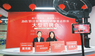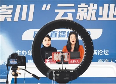 4月19日,在河北省秦皇島市聚賢人才市場(chǎng),工作人員使用網(wǎng)絡(luò)平臺(tái)進(jìn)行直播帶崗。 |