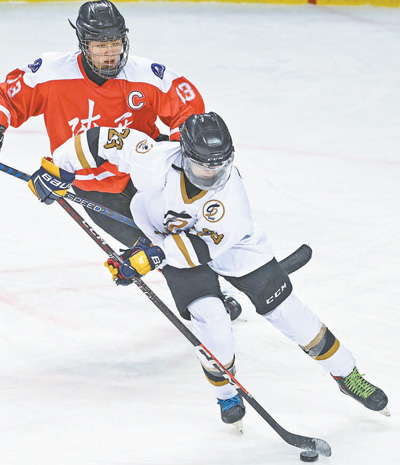 2月18日,四川隊(duì)球員楊鈺寬(前)在比賽中拼搶。當(dāng)日,在內(nèi)蒙古冰上運(yùn)動(dòng)訓(xùn)練中心冰球館進(jìn)行的第十四屆全國冬季運(yùn)動(dòng)會(huì)冰球項(xiàng)目男子青年組小組循環(huán)賽A組比賽中,陜西隊(duì)以7∶2戰(zhàn)勝四川隊(duì)。