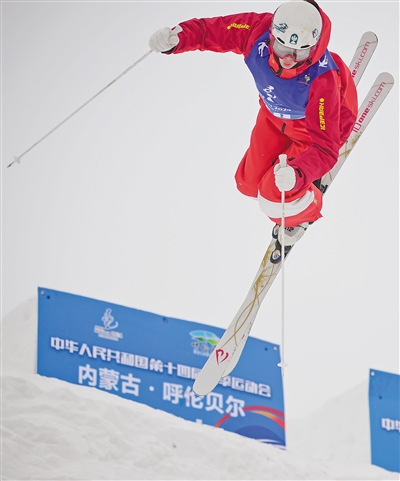 2月18日,北京隊(duì)選手龍昊在比賽中。最終,他以65.70分的成績獲得冠軍。當(dāng)日,第十四屆全國冬季運(yùn)動(dòng)會(huì)自由式滑雪公開組男子雪上技巧決賽在內(nèi)蒙古呼倫貝爾市扎蘭屯金龍山滑雪場(chǎng)進(jìn)行。