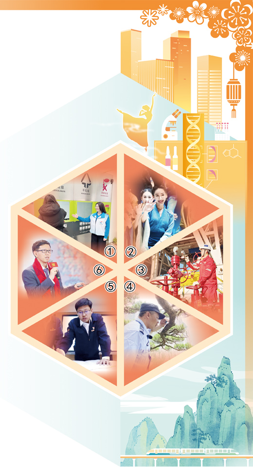 吳殊予攝 圖②:孟慶旸出演舞蹈詩劇《只此青綠》。 東方演藝集團供圖 圖③:劉崟琥在鉆井平臺調試設備。 姚 斌攝 圖④:胡曉春在檢查迎客松樹皮健康情況。 侯 晏攝 圖⑤:丁正江在研究勘探圖紙。 山東省地礦局第六地質大隊供圖 圖⑥:黃碩在進行學術交流。 受訪者供圖 |