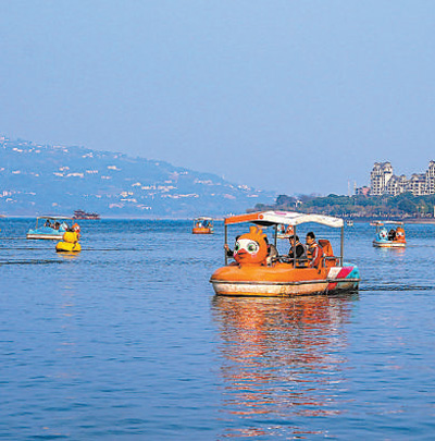 重慶市開州區(qū)漢豐湖景區(qū)景美如畫,游客在觀光游玩。