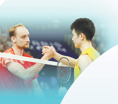 當(dāng)?shù)貢r(shí)間7月28日,巴黎奧運(yùn)會(huì)羽毛球項(xiàng)目男子單打小組賽結(jié)束后,中國(guó)選手(右)與瑞士選手握手致意。