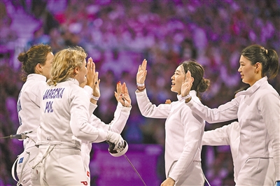 當(dāng)?shù)貢r(shí)間7月30日,中國(guó)體育代表團(tuán)選手(右)賽后與波蘭體育代表團(tuán)選手擊掌致意。
