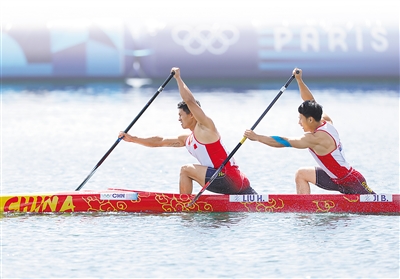 當(dāng)?shù)貢r(shí)間8月8日,中國(guó)隊(duì)選手劉浩(左)/季博文在巴黎奧運(yùn)會(huì)皮劃艇靜水男子雙人劃艇500米決賽中。