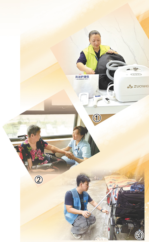 圖①:老年助浴員肖琳在店里收拾設(shè)備,準(zhǔn)備上門為老人助浴。
