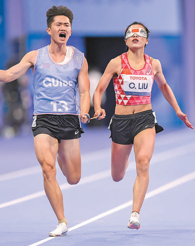 當(dāng)?shù)貢r間9月3日,劉翠青(右)和領(lǐng)跑員陳圣明在巴黎殘奧會田徑女子100米T11級決賽中。