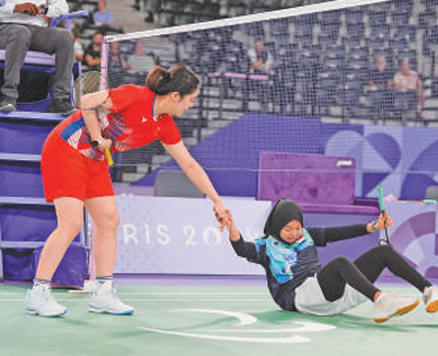 當(dāng)?shù)貢r間9月2日,巴黎殘奧會羽毛球女子單打SL3級比賽中,肖祖賢(左)幫助摔倒的對手。