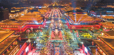 曲江池畔,大唐不夜城燈火輝煌。 西安曲江新區(qū)管委會供圖 |