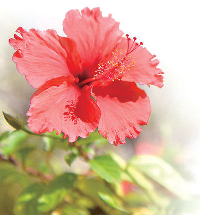 朱槿花大色艷,花蕊細長伸出于花瓣之外,花柱五裂,柱頭如粉球,花形俏麗喜慶,在我國兩廣地區(qū)被稱為“大紅花”,深受人們喜愛。在南寧,常見的朱槿花有十幾個品種,既有獨株高兩三米的小喬木、適合密植為樹籬的灌木,也有適合庭院、窗臺精巧布置的盆栽。