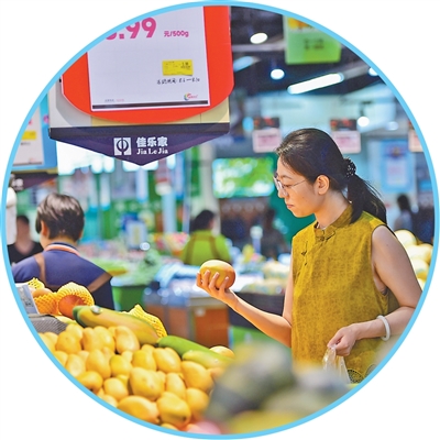 山東省青州市一家超市,消費(fèi)者在挑選水果。