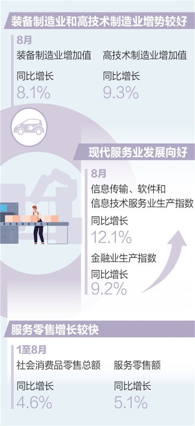 向高攀登。8月規(guī)模以上裝備制造業(yè)和高技術制造業(yè)增加值同比分別增長8.1%、9.3%,均明顯快于規(guī)模以上工業(yè),產(chǎn)業(yè)升級態(tài)勢良好。