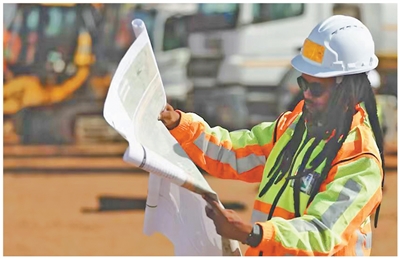 中國電建南非綠洲儲能項目工作人員在查看圖紙。