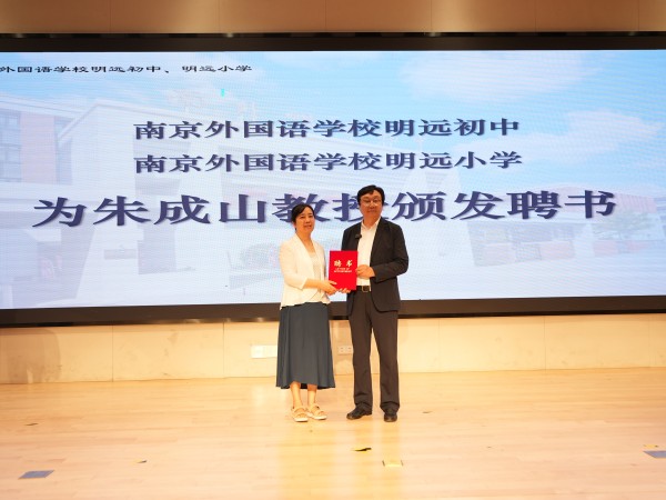 南京外國(guó)語(yǔ)學(xué)校明遠(yuǎn)初中、明遠(yuǎn)小學(xué)分別向朱成山教授頒發(fā)思政課教師聘書。