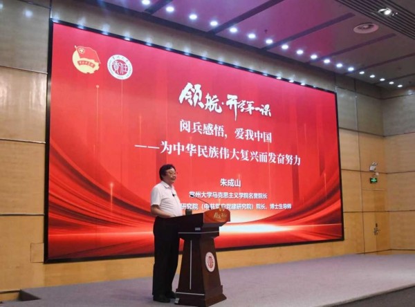 下午,朱成山應(yīng)邀出席由校團委組織的“不忘來時路 奮進新征程”——常州大學(xué)紀念中國人民抗日戰(zhàn)爭暨世界反法西斯戰(zhàn)爭勝利80周年“領(lǐng)航•開學(xué)第一課”,并在會上作題為《閱兵感悟、愛我中國——為中華民族偉大復(fù)興而發(fā)奮努力》“開學(xué)第一課”講座。朱成山面向全校共青團干部和部分大學(xué)生代表,分享了他以30多年閱歷的歷史工作者、曾穿戴過20年部隊軍裝的退役老同志和有著8年高校思政教師的三種不同身份,參加在北京參加閱兵式的三點感悟,特別比較了兩次參加抗戰(zhàn)勝利閱兵式的不同體驗并結(jié)合自身經(jīng)歷,對常大青年學(xué)子提出三點殷切希望:一是要銘記歷史,不忘中國從苦難走向輝煌的歷史;二是要永懷“愛國”之心,將個人理想融入國家發(fā)展大局;三是要勇?lián)?ldquo;責(zé)任”之使命,保持“勤奮”之態(tài),為中華民族偉大復(fù)興貢獻智慧與力量。據(jù)介紹,這是朱成山連續(xù)第四年為常州大學(xué)校團干部講授《開學(xué)第一課》。
