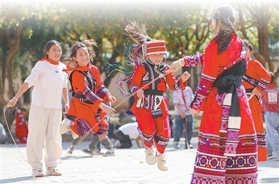 云南曲靖市陸良縣大莫古鎮(zhèn)新村街小學(xué),學(xué)生在操場上跳繩。