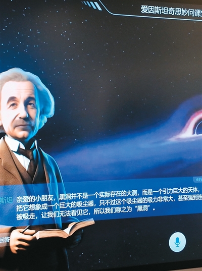 基于科大訊飛聯(lián)合科普中國(guó)共同研發(fā)的科普大模型,并應(yīng)用虛擬人技術(shù),訊飛星火智慧黑板“奇思妙問課堂”讓張衡、愛因斯坦等古今中外名人和科學(xué)家躍然屏上,用孩子能聽懂的語言回答各種天馬行空的提問,且每位AI老師的回答方式都貼合個(gè)人身份,有助于激發(fā)孩子們的好奇心和探索欲。圖為“愛因斯坦”和“李白”分別回答示例問題“黑洞是一個(gè)洞嗎?”