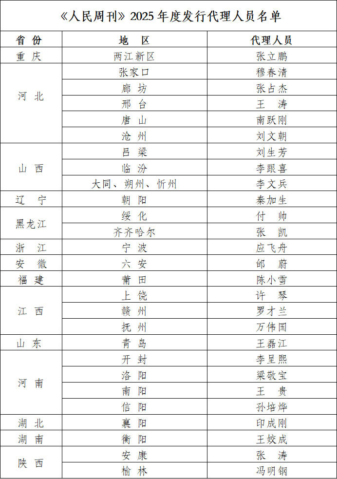 《人民周刊》是由人民日報社主管、人民日報出版社主辦的時事綜合類期刊,努力打造“人民日報現(xiàn)代傳播體系的窗口、主流思想輿論融合傳播的平臺、宣傳社會主義核心價值觀的陣地”。為嚴(yán)格規(guī)范周刊的發(fā)行工作,促進可持續(xù)發(fā)展,現(xiàn)將2025年度發(fā)行代理人員名單在人民周刊網(wǎng)上進行公布。具體如下: