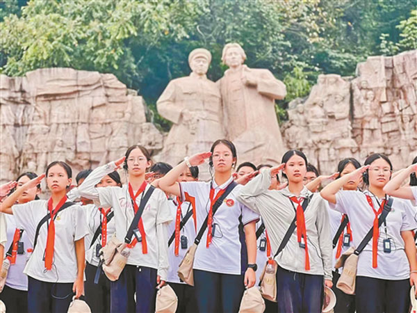 最讓學(xué)生們難忘的,是每條線路都有的儀式感環(huán)節(jié)。在井岡山革命烈士陵園,松柏蒼翠,氣氛莊嚴(yán)肅穆,每一名學(xué)生都斂聲靜氣,腳步輕緩。他們整齊列隊(duì),拾級(jí)而上,手捧白菊或敬獻(xiàn)花籃,向革命先烈表達(dá)深切緬懷和崇高敬意。這種儀式感,讓青少年在莊重的氛圍中,產(chǎn)生對(duì)歷史的敬畏、對(duì)先輩的感恩。