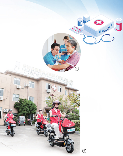 圖②:今年9月,浙江湖州市德清縣下渚湖街道社區(qū)衛(wèi)生服務(wù)中心,由街道商會贈送的11輛家庭醫(yī)生巡診電動自行車正式投入使用。圖為家庭醫(yī)生騎著巡診電動自行車準備上門為居民提供健康服務(wù)。