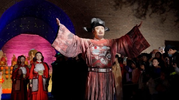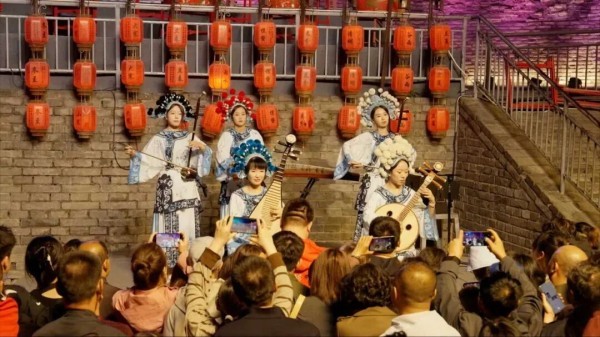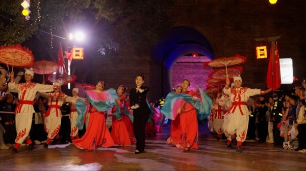 白天的表演中,《華陰老腔》以其粗獷質(zhì)樸的‌表演風(fēng)格,“喊”出了黃土文化的豪邁生命力‌,哈薩克族舞蹈《黑走馬》與游客同歌載舞,熱鬧非凡;榆陽非遺展示館內(nèi),榆林小曲細(xì)膩婉轉(zhuǎn),高亢嘹亮,別具一格。夜色初臨,榆林翁城燭龍銜耀,鎮(zhèn)遠(yuǎn)門外開城儀式上,隨著 “榆林主官”表演者宣布入城,老街表演正式拉開帷幕?!豆奈栌荜枴氛鸷抽_場,《陜北秧歌》隊(duì)伍開始巡街長游;米脂秧歌花轎、民樂演奏、陜北民歌等表演引得游客駐足觀看。(中共榆陽區(qū)委宣傳部供稿)