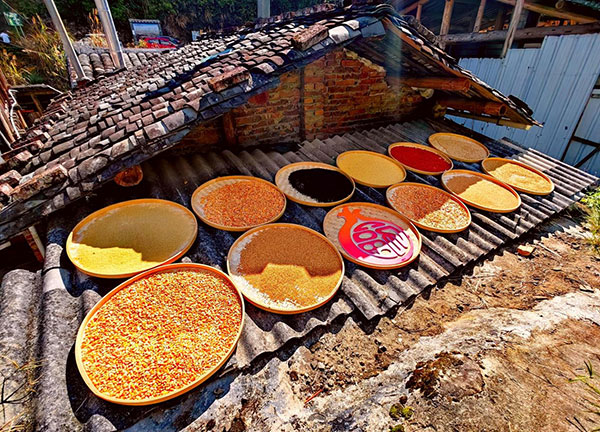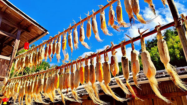 柯山畬族村是國(guó)家級(jí)天寶巖自然保護(hù)區(qū)內(nèi)唯一的少數(shù)民族社區(qū)村,傳統(tǒng)木質(zhì)結(jié)構(gòu)房屋依山而建,層層疊疊,錯(cuò)落有致,遠(yuǎn)觀形似一座小型的“布達(dá)拉宮”。曬秋時(shí)節(jié),金黃玉米、火紅辣椒、澄黃稻谷等色彩斑斕農(nóng)作物晾曬在家家戶戶的窗臺(tái)、石階、屋檐上,鋪滿在房前屋后的空地上,宛如大自然的調(diào)色盤,與古樸的村落相映成趣。村民們創(chuàng)意用晾曬的方式,把整個(gè)古村落裝點(diǎn)成動(dòng)態(tài)的“曬秋場(chǎng)”,處處如同一幅幅豐收的賞秋畫卷。