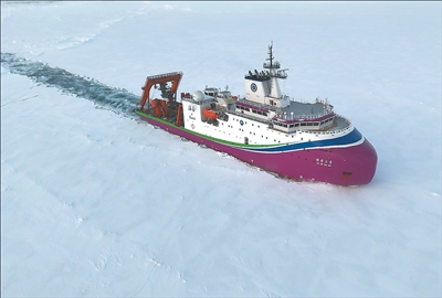 圖為“探索三號(hào)”在北極密集冰區(qū)破冰航行。