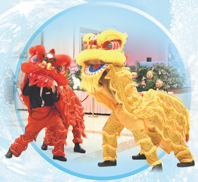 2月12日,亞布力山地媒體中心的舞獅表演。