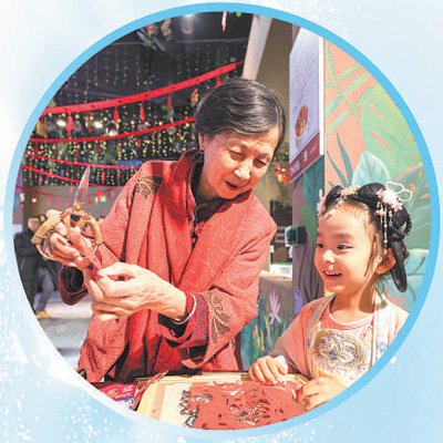 非遺文化展示區(qū),來自河南的吳豫琳小朋友兩手托腮,認真觀看黑龍江省級非遺代表性傳承人施麗華制作剪紙。“今年是蛇年,我就剪一條小蛇送給你吧!”施麗華笑著對吳豫琳說。剪刀開合,彩紙在施麗華手中快速翻轉,一條栩栩如生的“小蛇”很快出現在眼前。“謝謝奶奶,祝您元宵節(jié)快樂!”吳豫琳接過剪紙,甜甜地回應。