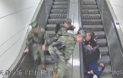 “快,救人!”危急時刻,武警四川總隊成都支隊某中隊3名正在執(zhí)行巡邏任務(wù)的武警官兵迅速行動。帶隊班長江明航隔著扶梯,一把抓住老奶奶的手臂,將其穩(wěn)住,同時借勢飛躍扶梯,用身體擋在另一位老人與階梯之間,并迅速將倒下的老人扶起,避免老人頭部受傷。戰(zhàn)士高榮駿和田澤備也緊隨其后,跑過來攙扶起電梯上的老人。