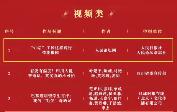 人民論壇網(wǎng)原創(chuàng)視頻作品《“90后”工匠這樣踐行技能報(bào)國(guó)》榮獲視頻類(lèi)優(yōu)秀作品