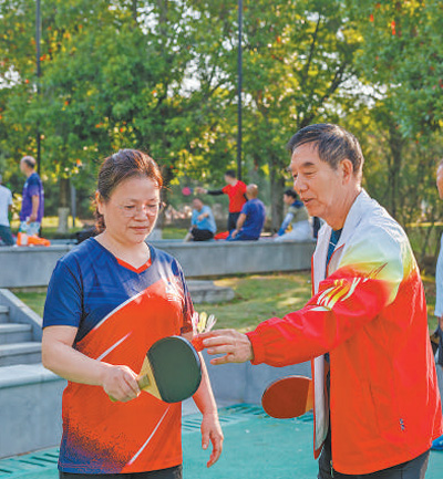 項政惠(右)教愛好者練習(xí)嗒嗒球。