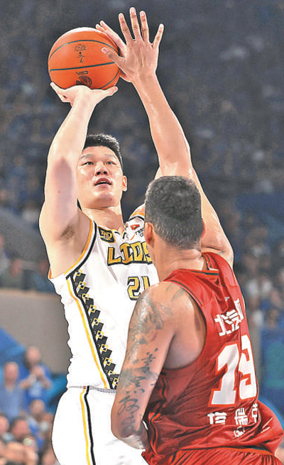 浙江廣廈隊球員胡金秋(左)在比賽中。
