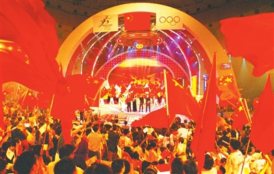 2001年7月13日,人們?cè)谘胍曆莶ゴ髲d慶祝北京申奧成功。