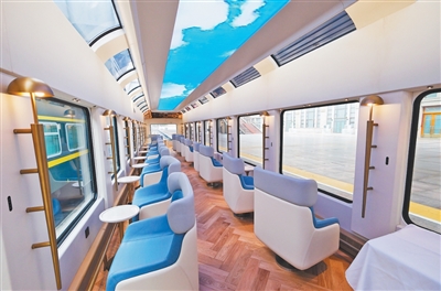 列車功能設(shè)計(jì)從交通工具向“移動(dòng)觀景客廳”轉(zhuǎn)變。全列7節(jié)編組,包含4節(jié)觀光車廂、1節(jié)主題餐車、1節(jié)全景觀光車廂和1節(jié)多功能娛樂車廂,可載客208人,形成集觀光、餐飲、娛樂于一體的移動(dòng)文化空間。其中,全景觀光車廂和多功能娛樂車廂創(chuàng)新采用超大觀景窗,側(cè)頂天窗與頂部LED天幕無縫銜接,給旅客帶來“車在景中行,人在畫中游”的體驗(yàn)。4節(jié)觀光車廂內(nèi)設(shè)有車廂卡座、對(duì)窗座椅區(qū)。