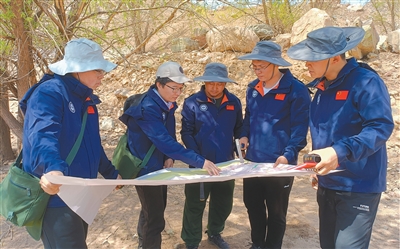 楊彪(左二)與團隊工作人員在分析礦脈走向。