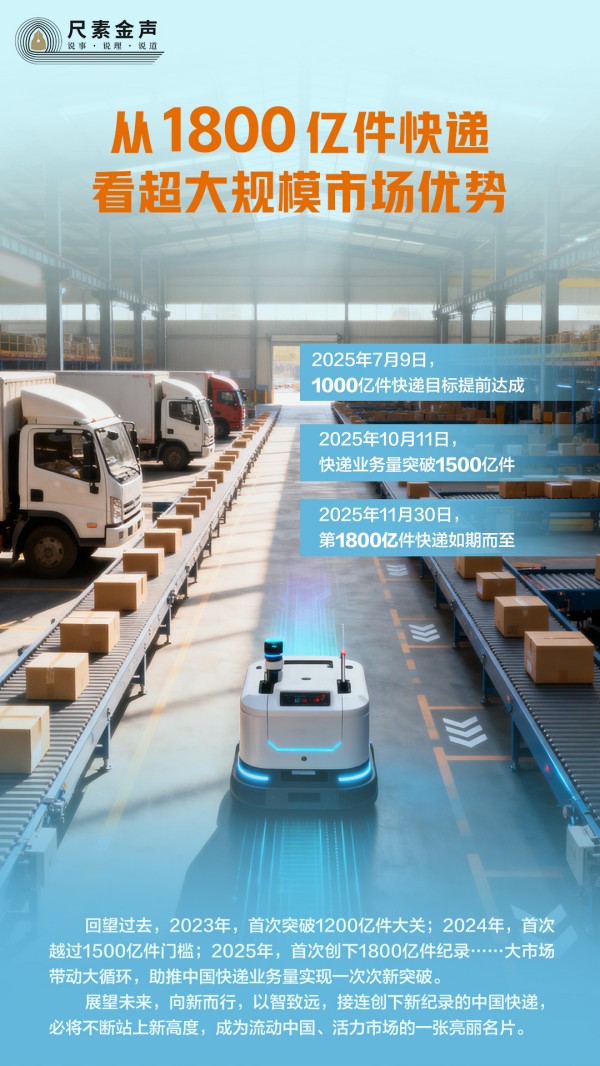 回望過去,2023年,首次突破1200億件大關(guān);2024年,首次越過1500億件門檻;2025年,首次創(chuàng)下1800億件紀(jì)錄……大市場帶動(dòng)大循環(huán),助推中國快遞業(yè)務(wù)量實(shí)現(xiàn)一次次新突破。