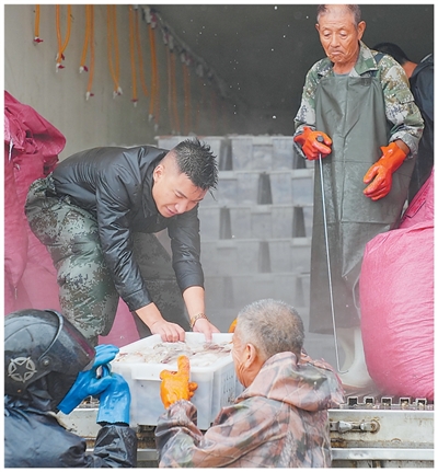令人驚訝的是,船未靠岸,這批海鮮就已售罄,即將發(fā)往濟南、威海。“電商客戶信任,我們更要保證新鮮。”王脈抹了一把臉上的雨水說。