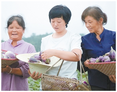 湖南常德市鼎城區(qū)堯天坪鎮(zhèn),“小蜜蜂”有機農(nóng)場主李丹(中)和農(nóng)戶們交流秋茄子收成。