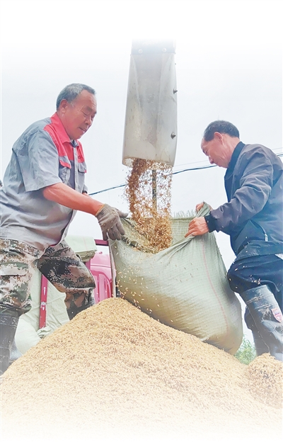 玉堂村村民將機械收割出倉的稻谷進行裝袋。