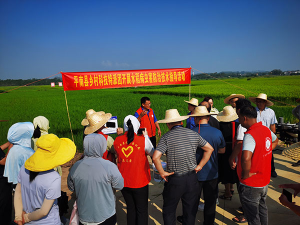 廣西平南縣“一縣一團(tuán)”鄉(xiāng)村科技特派員現(xiàn)場(chǎng)開展水稻病蟲害防治技術(shù)指導(dǎo)。林益群 供圖