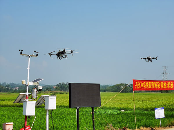 廣西平南縣鄉(xiāng)村科技特派員利用無(wú)人機(jī)開展水稻病蟲害防治。林益群 供圖
