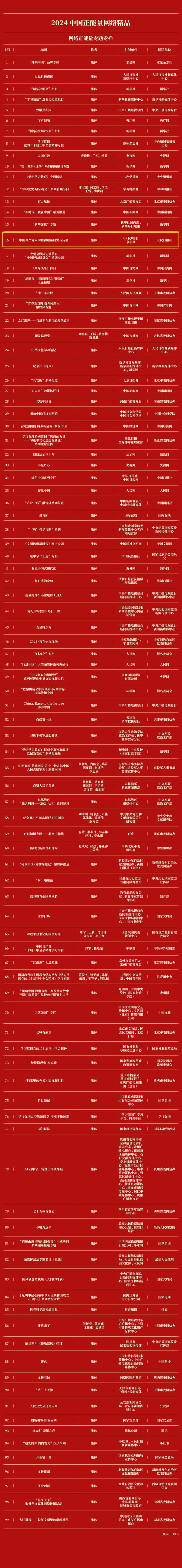 3月30日,由中央網(wǎng)信辦、中央廣播電視總臺、廣西壯族自治區(qū)黨委網(wǎng)信委主辦的2025中國網(wǎng)絡媒體論壇在南寧舉辦。開幕式上,舉辦了2024中國正能量網(wǎng)絡精品發(fā)布儀式,揭曉了2024中國正能量網(wǎng)絡精品入選作品,其中,人民日報社報送、《人民周刊》雜志社主創(chuàng)的《中國共產(chǎn)黨人的精神譜系研究與傳播》欄目入選。