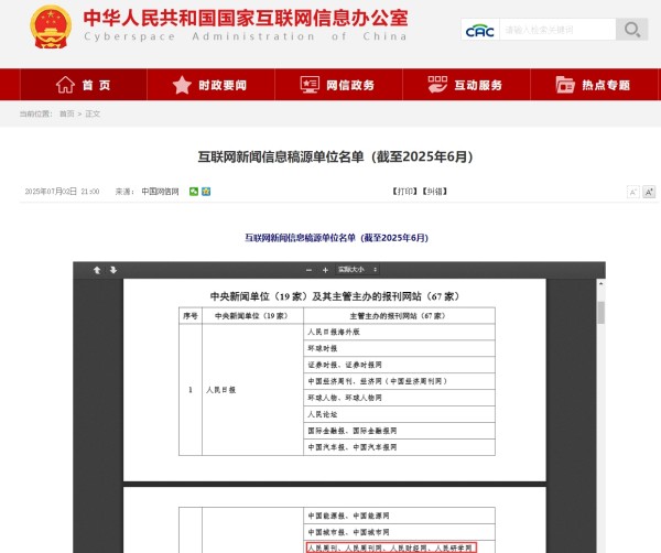 7月2日,國家互聯(lián)網(wǎng)信息辦公室公布最新版互聯(lián)網(wǎng)新聞信息稿源單位名單(截至2025年6月),人民周刊、人民周刊網(wǎng)、人民財經(jīng)網(wǎng)和人民研學(xué)網(wǎng)在列。