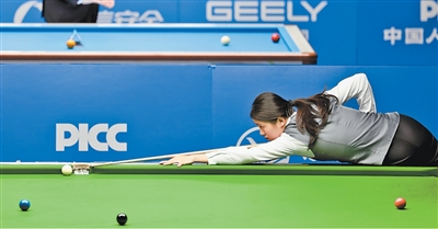 中國(guó)隊(duì)運(yùn)動(dòng)員白雨露在臺(tái)球女子斯諾克6紅球比賽中。