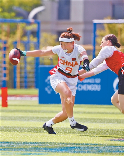 中國(guó)隊(duì)運(yùn)動(dòng)員(左)在腰旗橄欖球比賽中。