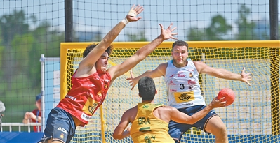 西班牙隊(duì)守門員(右)和隊(duì)友(左)在沙灘手球男子銅牌賽中。