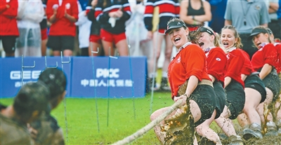 瑞士隊(duì)運(yùn)動(dòng)員在女子室外拔河500公斤級(jí)比賽中。